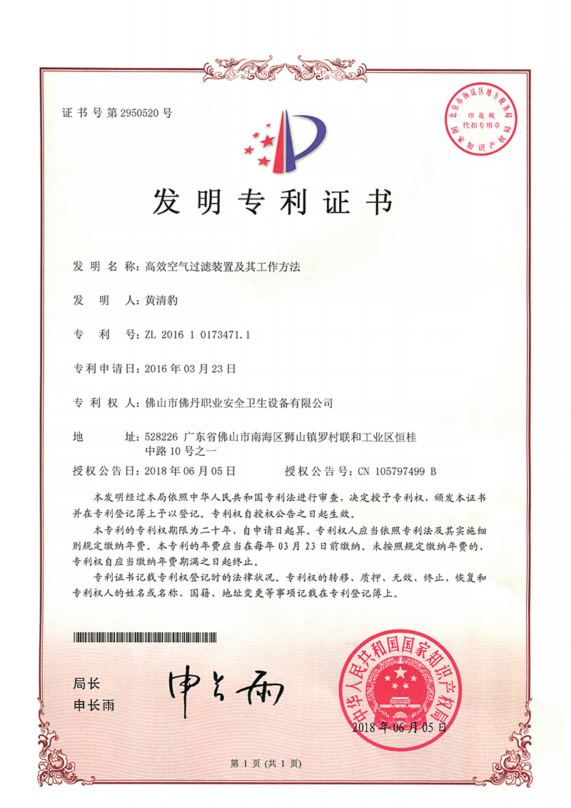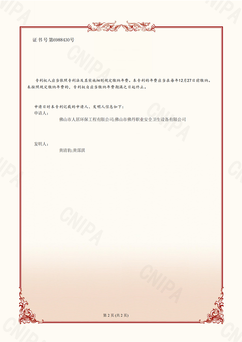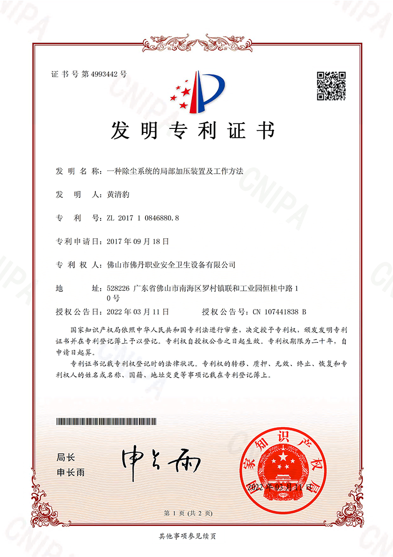 發(fā)明專利證書7:一種除塵系統(tǒng)的局部加壓裝置及工作方法(佛丹-2022)