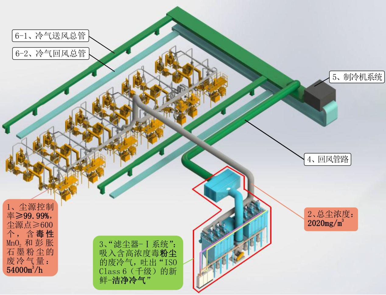 依托自主核心的 顛覆性技術(shù) ------ “ 把 普通 毒性二氧化錳 和 石墨粉 塵 污染嚴(yán)重(2020 mg/m3 )的廢 冷氣 直接轉(zhuǎn)化為千級潔凈 冷氣 (5×10 -6 mg/m3 )---100% 送回車間內(nèi)循環(huán)使用” ,同步實(shí)現(xiàn): “粉塵污染嚴(yán)重的重塵車間”(3-30mg/m3)越過“國標(biāo)車間”(0.1-6.0mg/m3)直接提升為“免口罩車間”(≤0.03mg/m3)、冷氣100%回收、貴重粉塵回收率≥99.999%的三重目的。